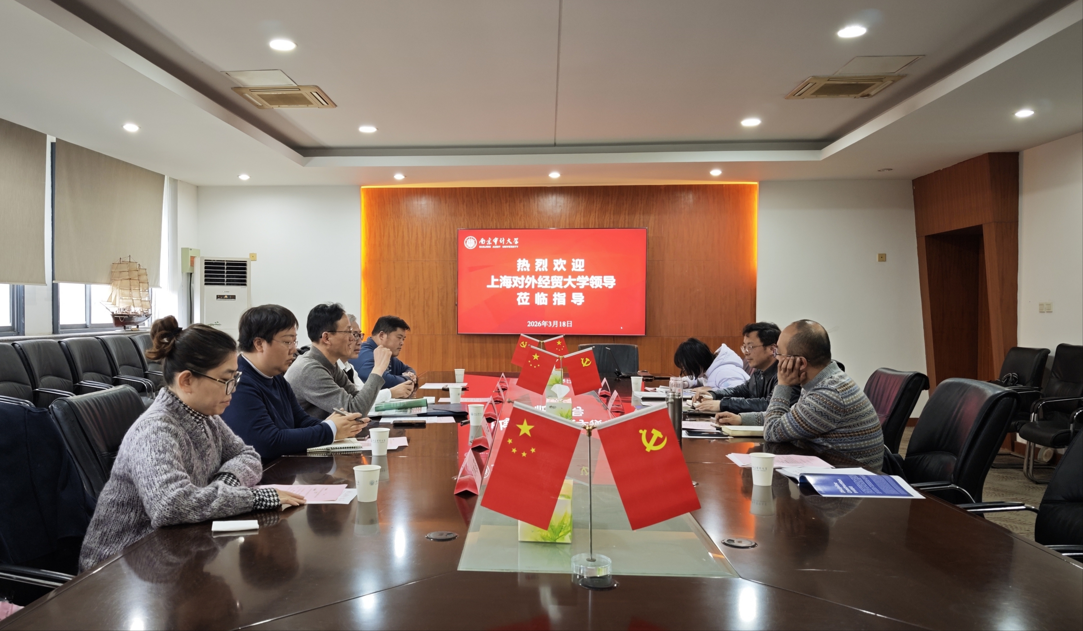 3月18日下午,上海对外经贸大学研究生院副院长吴晓锋一行5人莅临南京审计大学,围绕研究生专业学位教育高质量发展开展专题调研交流。会议由我校研究生院副院长葛世龙主持,研究生院副院长翟国及培养办公室相关人员参加座谈。